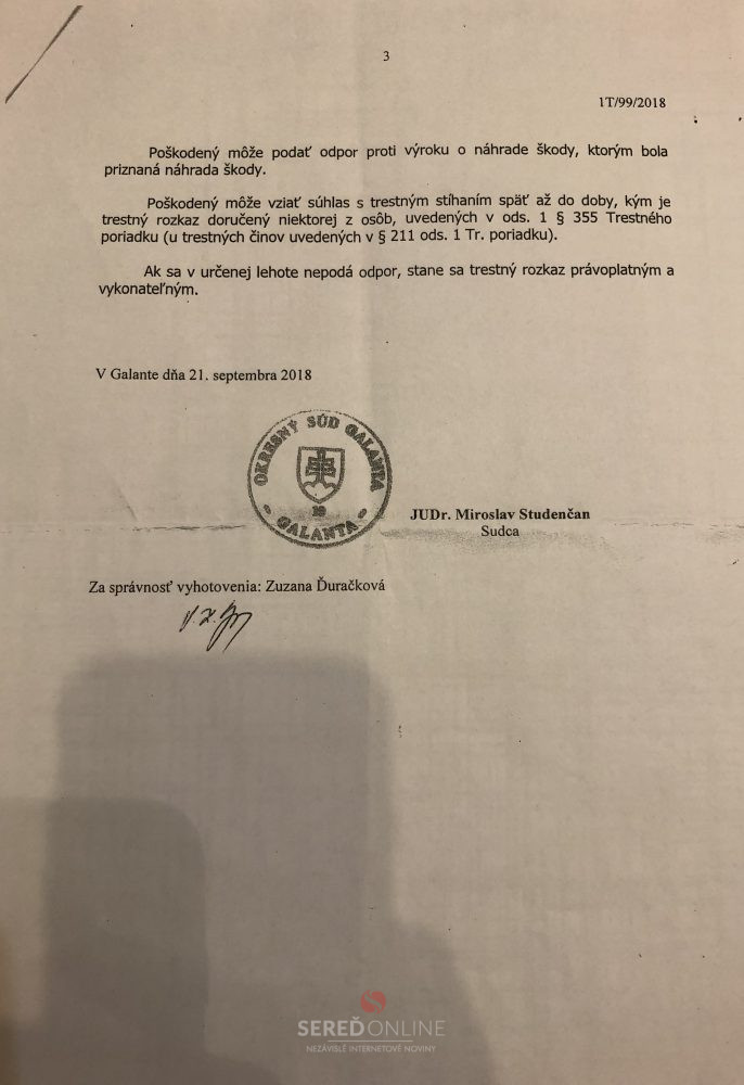 Tento Trestný rozkaz bol zrušený na základe odvolania sa odsúdeným starostom a štatutárom obce Adriánom Machom a bolo nariadené pojednávanie, ktoré bude pokračovať ďaľším pojendávaním na Okresnom súde v Galante už zajtra o 13:00 hodine.