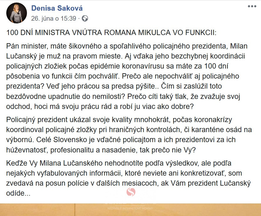 Pán minister, máte šikovného a spoľahlivého policajného prezidenta, Milan Lučanský je muž na pravom mieste. Aj vďaka jeho bezchybnej koordinácii policajných zložiek počas epidémie koronavírusu sa máte za 100 dní pôsobenia vo funkcii čím pochváliť. Prečo ale nepochváliť aj policajného prezidenta? Veď jeho prácou sa predsa pýšite.. Čím si zaslúžil toto bezdôvodne upadnutie do nemilosti? Prečo cíti taký tlak, že zvažuje svoj odchod, hoci má svoju prácu rád a robí ju viac ako dobre?