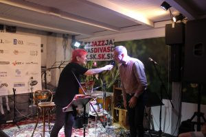 Po krátkej prestávke nasledoval koncert speváčky Jany Koubkovej, nestorky českého džezu, ktorú sprevádzal skvelý pianista Ondřej Kabrna. Jana Koubková okrem iného skladá piesne i filmovú hudbu, je činná v rozhlase a je autorkou fejtónov, stĺpčekov a poézie. Je to sympatická dáma, prejavujúca a vyžarujúca ohromné množstvo energie. Hneď prvou pesničkou Za to může jazz… si obecenstvo získala a naladila ho na svoju vlnu. V speve, scate a v pohybe na pódiu bola ako ryba vo vode a s o generáciu mladším pianistom vytvárali jedinečnú hudobnú symbiózu. Nechýbali hravosť, žartíky a radosť z improvizácie. V pesničke Georgea Gershwina a Pavla Koptu Chtěla bych mít vagón spací (The Man I Love) sa, ako aj v mnohých iných na tomto koncerte, striedali temperamentné i jemné nálady a v pesničke Afro Blue od Monga Santamariu Jana Koubková tlieskala, smiala sa a výskala. Niektoré skladby v ten večer obohatila napodobňovaním zvuku trúbky vlastným hlasom a predstavila sa aj ako zdatná speváčka zdžezovaných ľudových piesní. V jej speve bolo toľko nadšenia, že mikrofón dostával poriadne zabrať. Ako povedala, je veľmi rada, že Louis Armstrong vymyslel scat. Tiež nám predviedla zaujímavý perkusný hudobný nástroj – rainstick -, pôvodom z južnej Ameriky. Jana Koubková, ako veľmi originálna a svojská umelkyňa, vtisla každej, aj prevzatej pesničke svoju originálnu pečať, či to bola Agua De Beber alebo Basin Street Blues. Speváčka i klavirista obecenstvo očarili, počas skladieb sa často ozýval potlesk do rytmu či lúskanie prstami a v pesničke Časy se mění, ktorú kedysi preslávilo trio Golden Kids, si poslucháči s chuťou zaspievali refrén. Mala som pocit, že hlas Jany Koubkovej má farby ako dúha a aj setlist koncertu bol veľmi rozmanitý. Speváčka zaspievala napríklad Bourée od Johanna Sebastiana Bacha (aj s využitím malého perkusného hudobného nástroja) či Beethovenovu Eurohymnu so svojím vlastným vtipným textom a náruživo predniesla zopár svojich rovnako vtipných básní. Podľa vlastných slov má rada „zvukomalebnorytmickoptákovskú“ poéziu. Odpoveďou Jany Koubkovej na pandémiu koronavírusu je pesnička Blues (ne)ohrožené seniorky. Text napísala ona a hudbu zložil Ondřej Kabrna. Dozvedeli sme sa, že sa chystá aj natáčanie videoklipu k tejto pesničke. Koncert uplynul ako voda a, samozrejme, po aplauze došlo i na prídavok. Bola ním swingovka I Can´t Give You Anything But Love. Počas nej začal jeden fanúšik v publiku spievať ako Louis Armstrong, Jana Koubková ho vyvolala na pódium a spievali spolu. Bolo to veľmi príjemné spestrenie na záver a publikum jasalo.