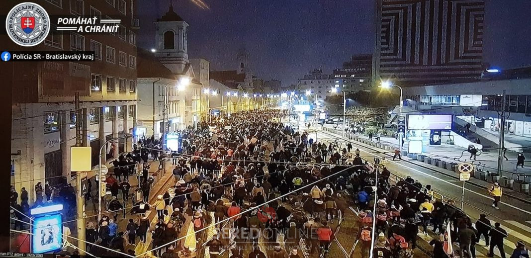 Hliadky bratislavských policajtov dohliadajú na bezpečnosť účastníkov verejného zhromaždenia, ktorí sa krátko po 16.30 h začali presúvať zo Šafárikovho námestia na námestie Slobody.