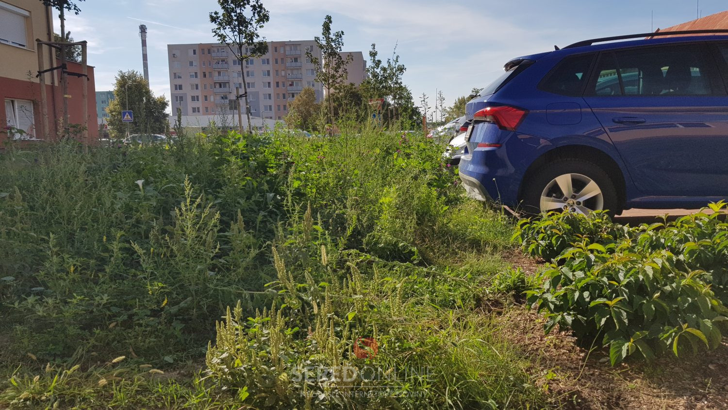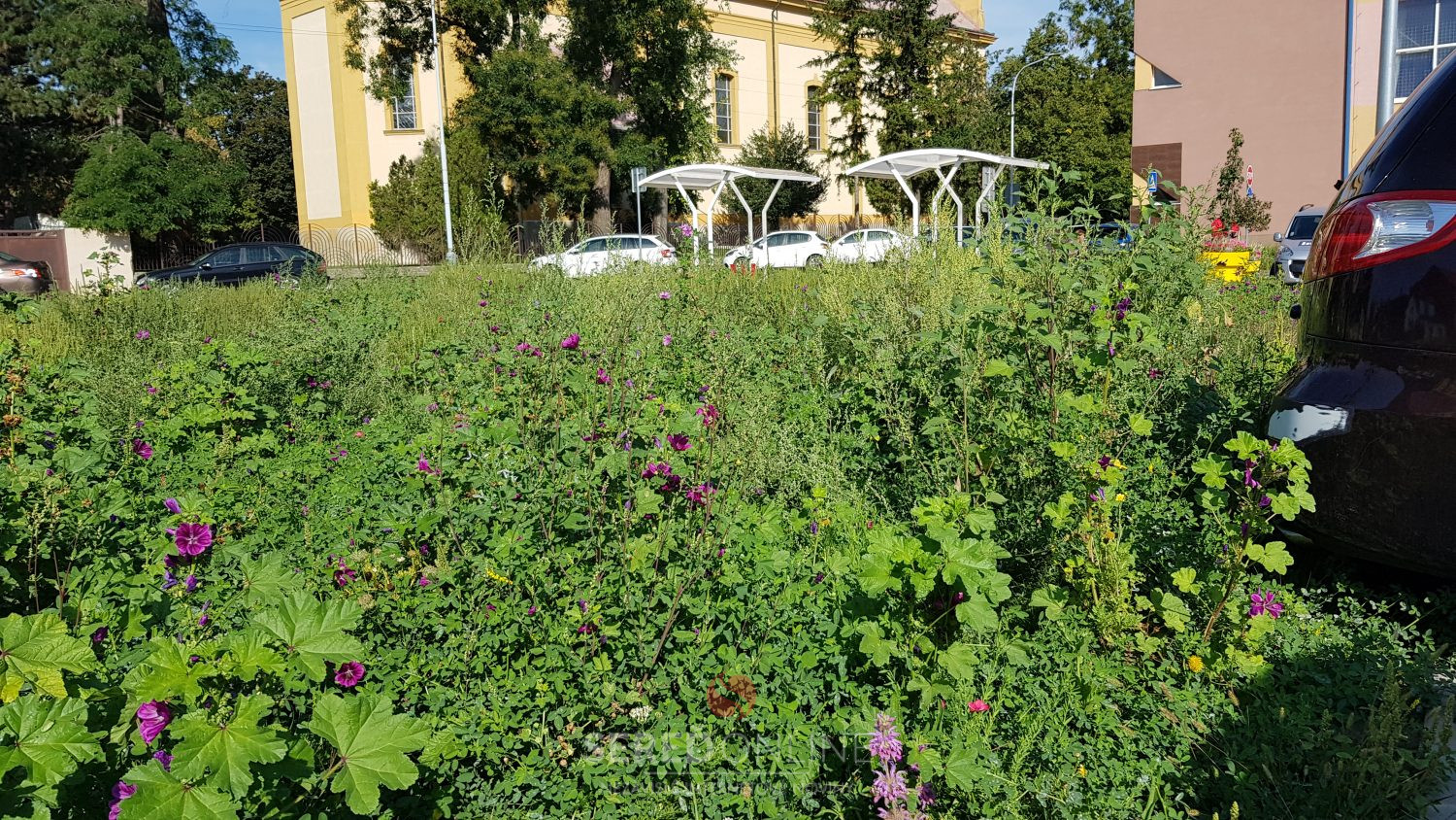 Včera spoza do výšky vyrastenej buriny nebolo vidieť osobné autá. Fotografie dokumentujú stav výšky buriny po strechu na parkovisku odstavených SUV-ečiek.