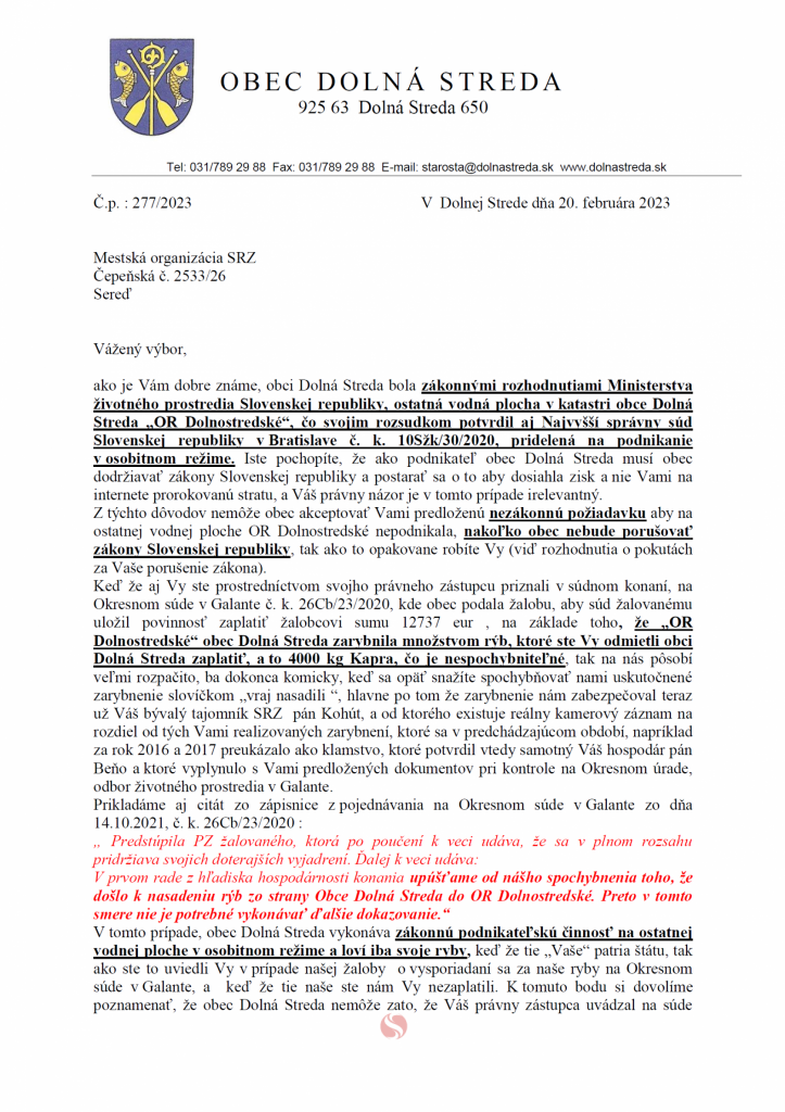 obdržali sme od Vás odpoveď, v ktorej uvádzate, že vraj ste ochotní sa vysporiadať za rybiu osádku v OR Dolnostredské. Avšak tento Váš tvrdený zámer ste nepodložili rozpočtovým krytím ani nijakou reálnou ponukou vyrovnania.